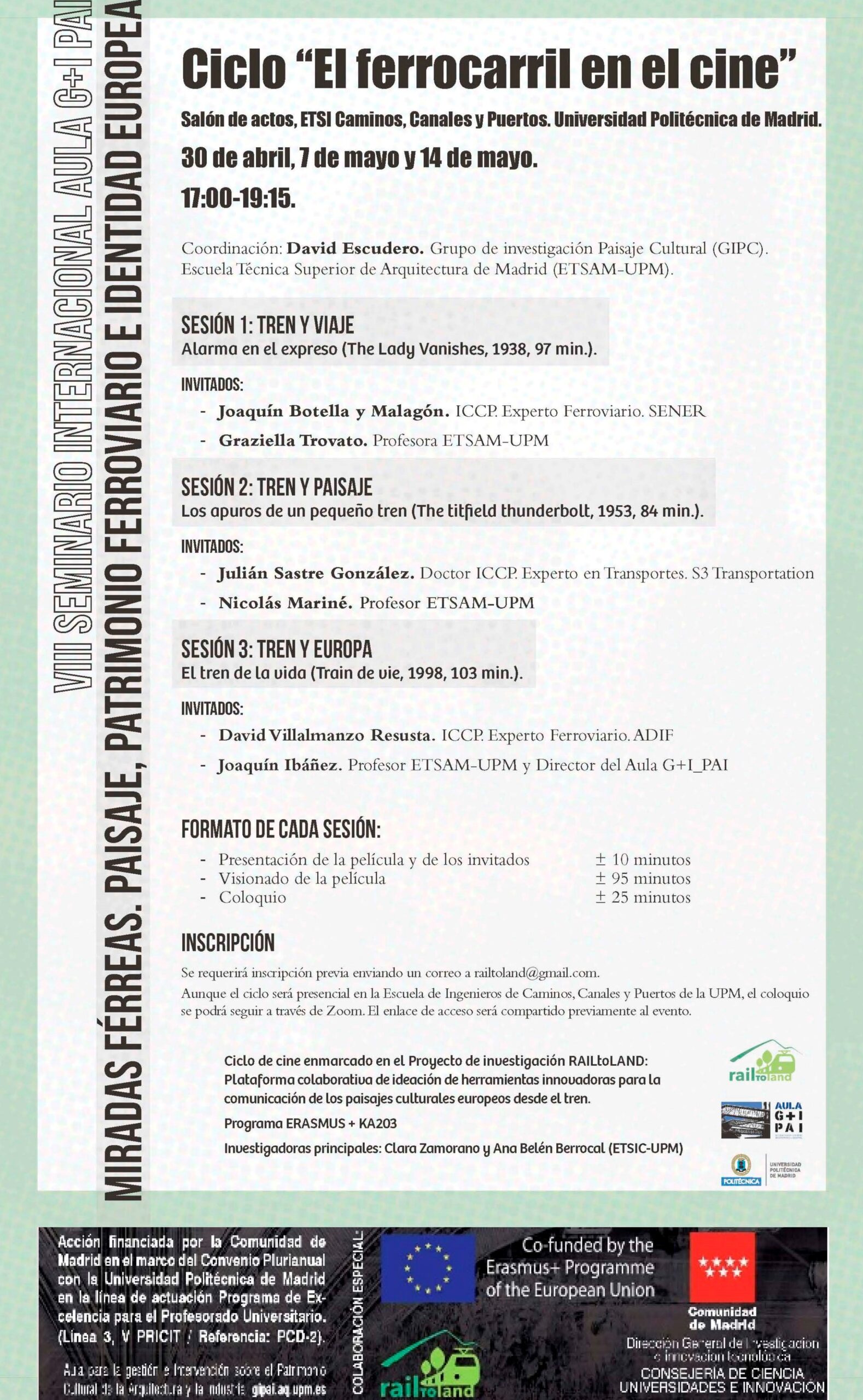 Ciclo de Cine enmarcado en el Proyecto de Investigación RAILtoLAND: Plataforma colaborativa de ideación de herramientas innovadoras para la comunicación de los paisajes culturales europeos desde el tren. Investigadoras principales: Clara Zamorano y Ana Belén Berrocal (ETSIC-UPM).
